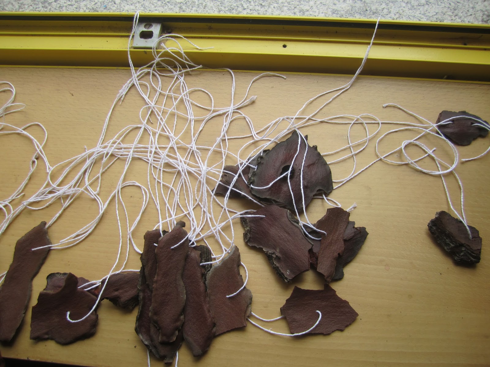 comenzamos facendo os colares. Perforamos a corteza cunha punta para a